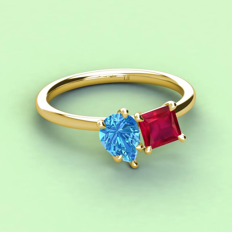 A beautiful symbol of everlasting love, this duo two-stone ring showcases a pair of Pear Shape Blue Topaz shimmering alongside of a luminous Princess Shape Lab Created Ruby crafted beautifully that represents two of you together.