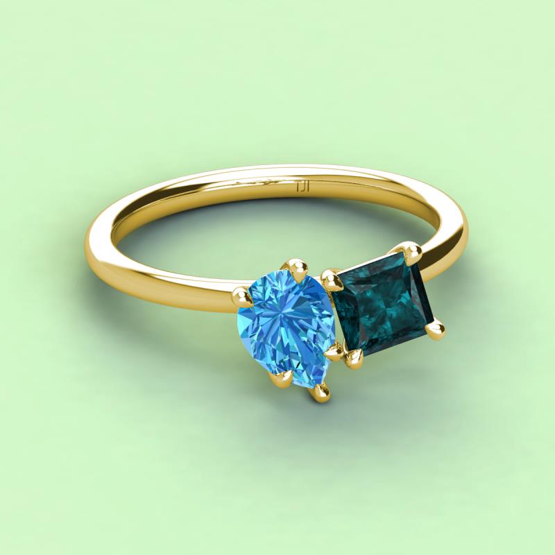 A beautiful symbol of everlasting love, this duo two-stone ring showcases a pair of Pear Shape Blue Topaz shimmering alongside of a luminous Princess Shape London Blue Topaz crafted beautifully that represents two of you together.