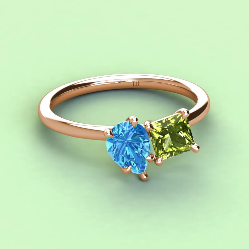 A beautiful symbol of everlasting love, this duo two-stone ring showcases a pair of Pear Shape Blue Topaz shimmering alongside of a luminous Princess Shape Peridot crafted beautifully that represents two of you together.