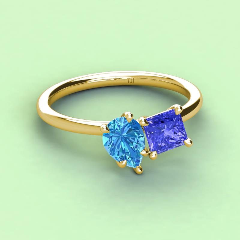 A beautiful symbol of everlasting love, this duo two-stone ring showcases a pair of Pear Shape Blue Topaz shimmering alongside of a luminous Princess Shape Tanzanite crafted beautifully that represents two of you together.
