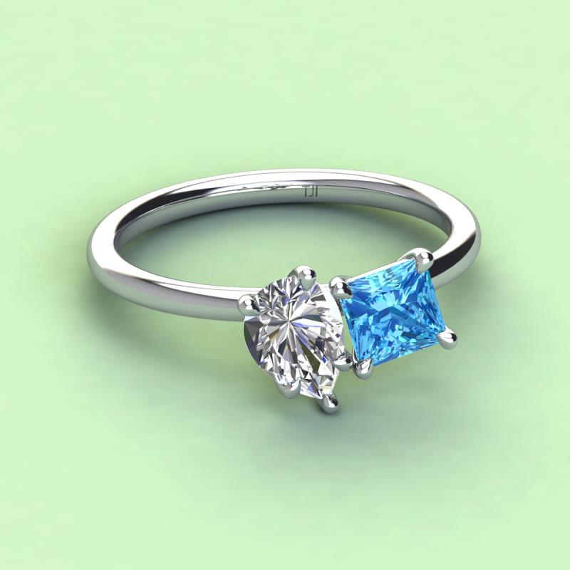 A beautiful symbol of everlasting love, this duo two-stone ring showcases a pair of Pear Shape IGI Certified Lab Grown Diamond shimmering alongside of a luminous Princess Shape Blue Topaz crafted beautifully that represents two of you together.