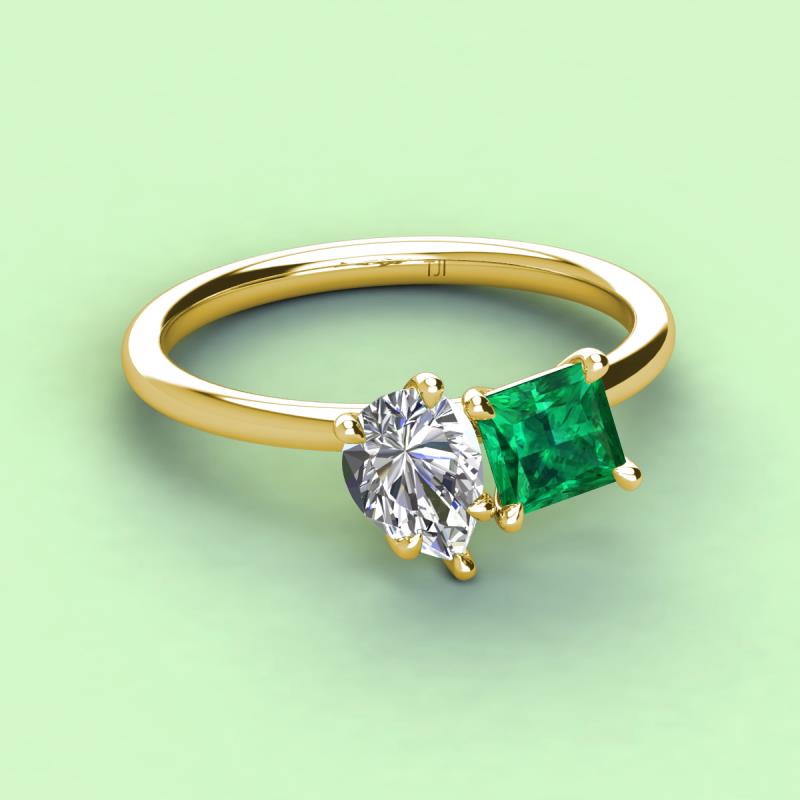 A beautiful symbol of everlasting love, this duo two-stone ring showcases a pair of Pear Shape IGI Certified Lab Grown Diamond shimmering alongside of a luminous Princess Shape Lab Created Emerald crafted beautifully that represents two of you together.