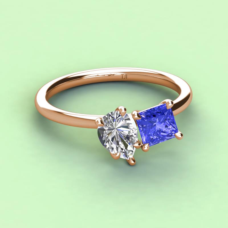 A beautiful symbol of everlasting love, this duo two-stone ring showcases a pair of Pear Shape IGI Certified Lab Grown Diamond shimmering alongside of a luminous Princess Shape Tanzanite crafted beautifully that represents two of you together.