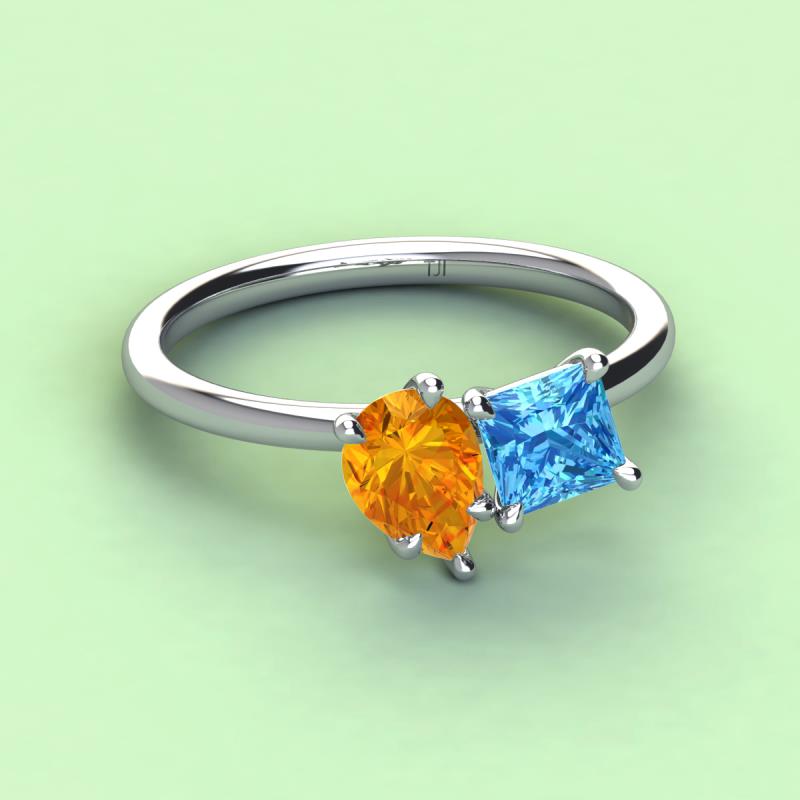 A beautiful symbol of everlasting love, this duo two-stone ring showcases a pair of Pear Shape Citrine shimmering alongside of a luminous Princess Shape Blue Topaz crafted beautifully that represents two of you together.