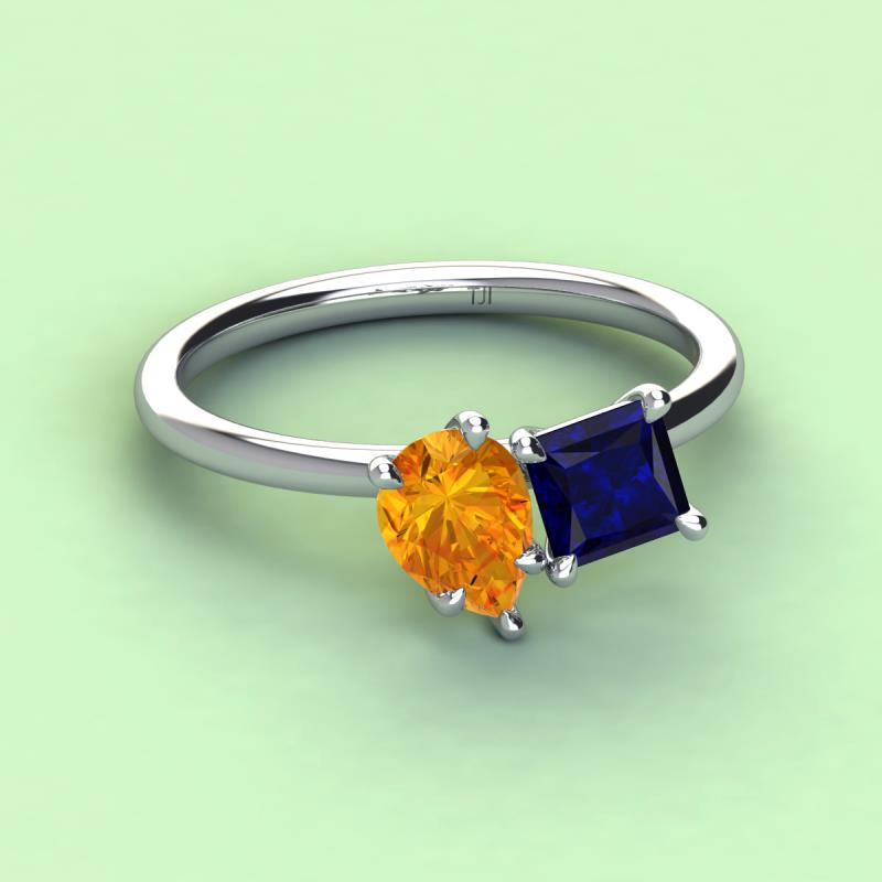 A beautiful symbol of everlasting love, this duo two-stone ring showcases a pair of Pear Shape Citrine shimmering alongside of a luminous Princess Shape Lab Created Blue Sapphire crafted beautifully that represents two of you together.