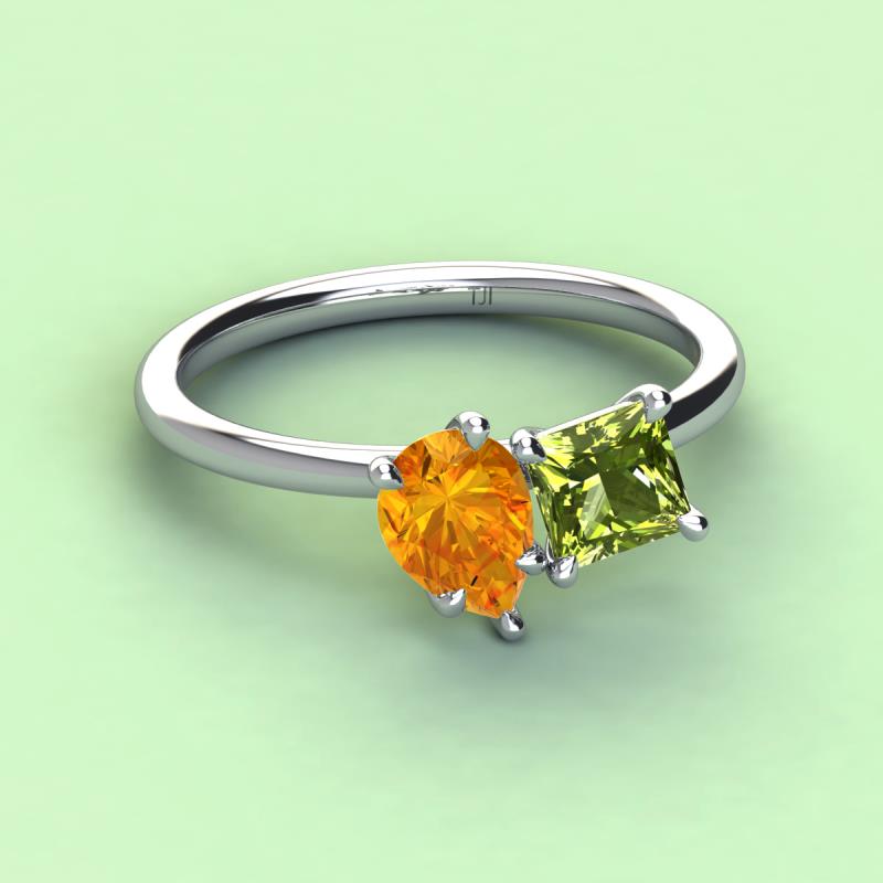A beautiful symbol of everlasting love, this duo two-stone ring showcases a pair of Pear Shape Citrine shimmering alongside of a luminous Princess Shape Peridot crafted beautifully that represents two of you together.