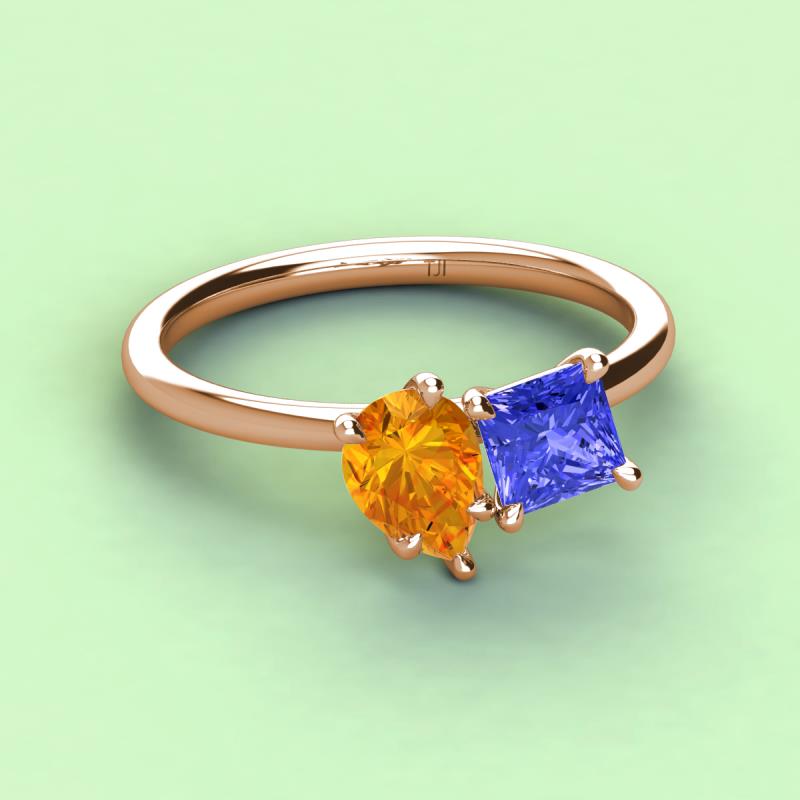 A beautiful symbol of everlasting love, this duo two-stone ring showcases a pair of Pear Shape Citrine shimmering alongside of a luminous Princess Shape Tanzanite crafted beautifully that represents two of you together.