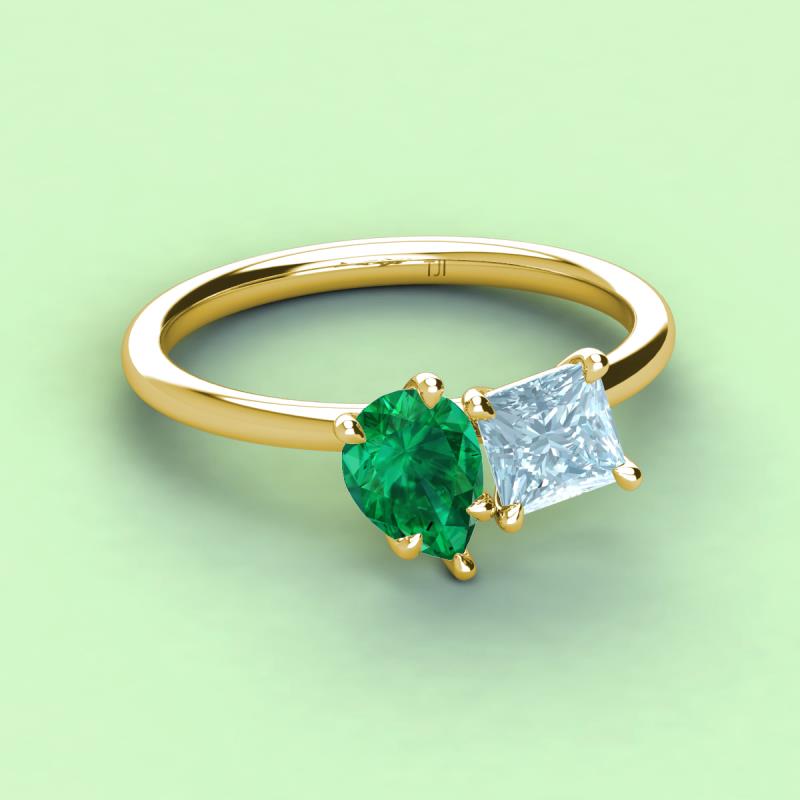 A beautiful symbol of everlasting love, this duo two-stone ring showcases a pair of Pear Shape Emerald shimmering alongside of a luminous Princess Shape Aquamarine crafted beautifully that represents two of you together.