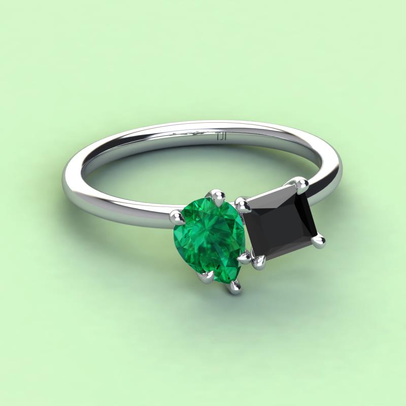 A beautiful symbol of everlasting love, this duo two-stone ring showcases a pair of Pear Shape Emerald shimmering alongside of a luminous Princess Shape Black Diamond crafted beautifully that represents two of you together.