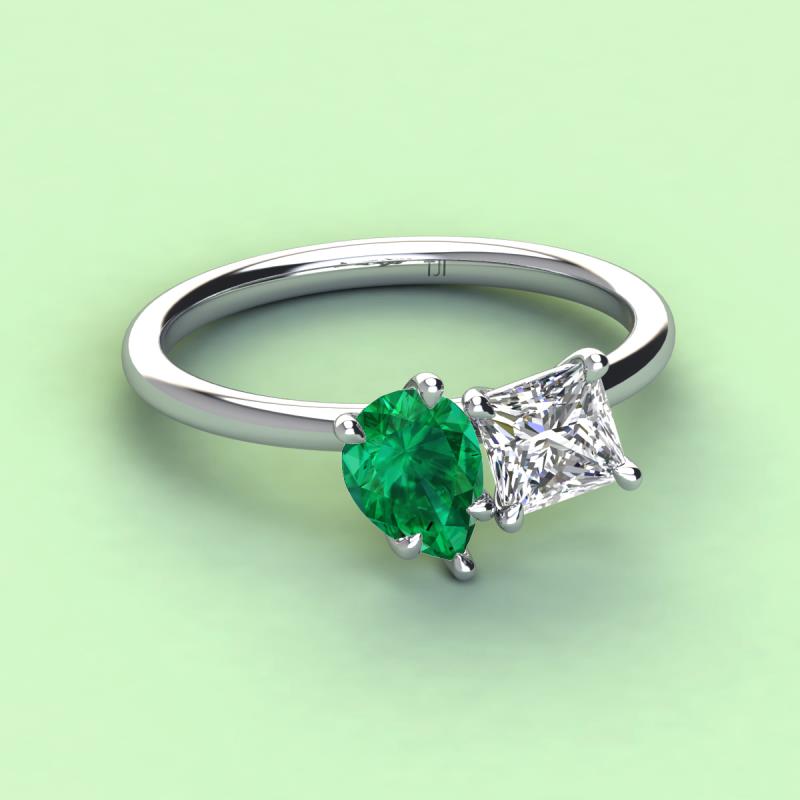 A beautiful symbol of everlasting love, this duo two-stone ring showcases a pair of Pear Shape Emerald shimmering alongside of a luminous Princess Shape Forever Brilliant Moissanite crafted beautifully that represents two of you together.