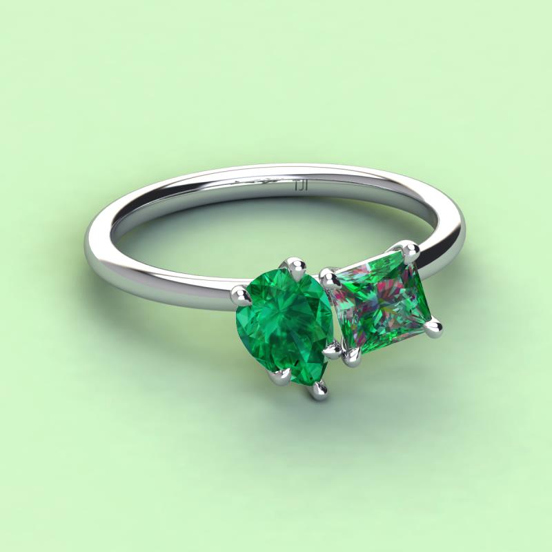 A beautiful symbol of everlasting love, this duo two-stone ring showcases a pair of Pear Shape Emerald shimmering alongside of a luminous Princess Shape Lab Created Alexandrite crafted beautifully that represents two of you together.