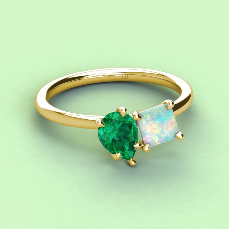 A beautiful symbol of everlasting love, this duo two-stone ring showcases a pair of Pear Shape Emerald shimmering alongside of a luminous Princess Shape Lab Created Opal crafted beautifully that represents two of you together.