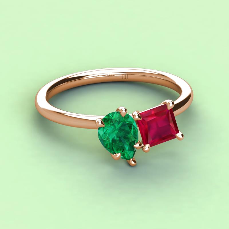 A beautiful symbol of everlasting love, this duo two-stone ring showcases a pair of Pear Shape Emerald shimmering alongside of a luminous Princess Shape Lab Created Ruby crafted beautifully that represents two of you together.