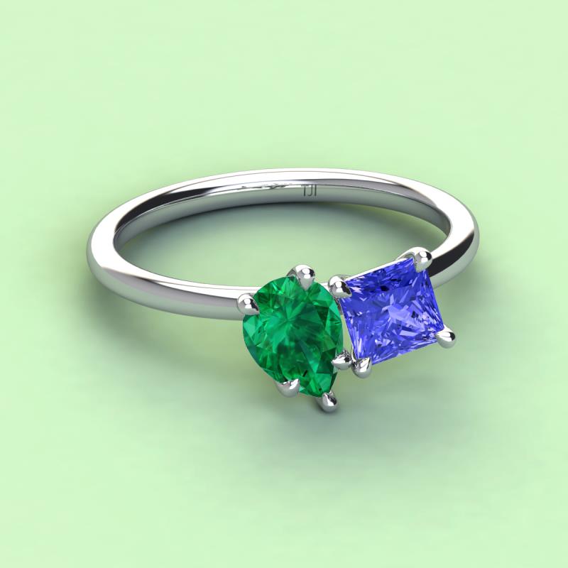 A beautiful symbol of everlasting love, this duo two-stone ring showcases a pair of Pear Shape Emerald shimmering alongside of a luminous Princess Shape Tanzanite crafted beautifully that represents two of you together.