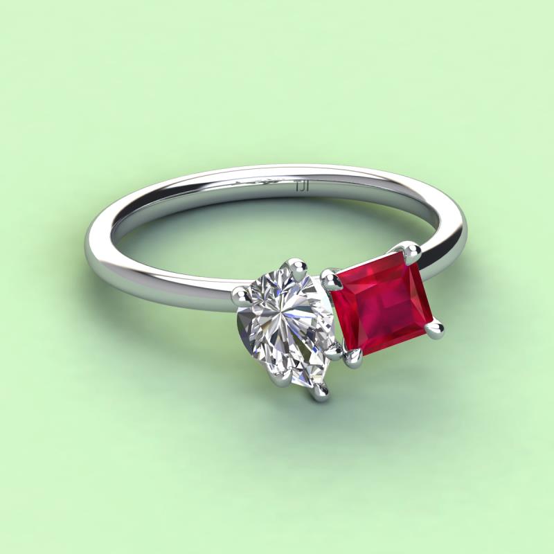 Pear Shape Forever Brilliant Moissanite & Princess Shape Lab Created Ruby 2.74 ctw Four Prong Womens 2 Stone Duo Engagement Ring 14K White Gold More Details ...