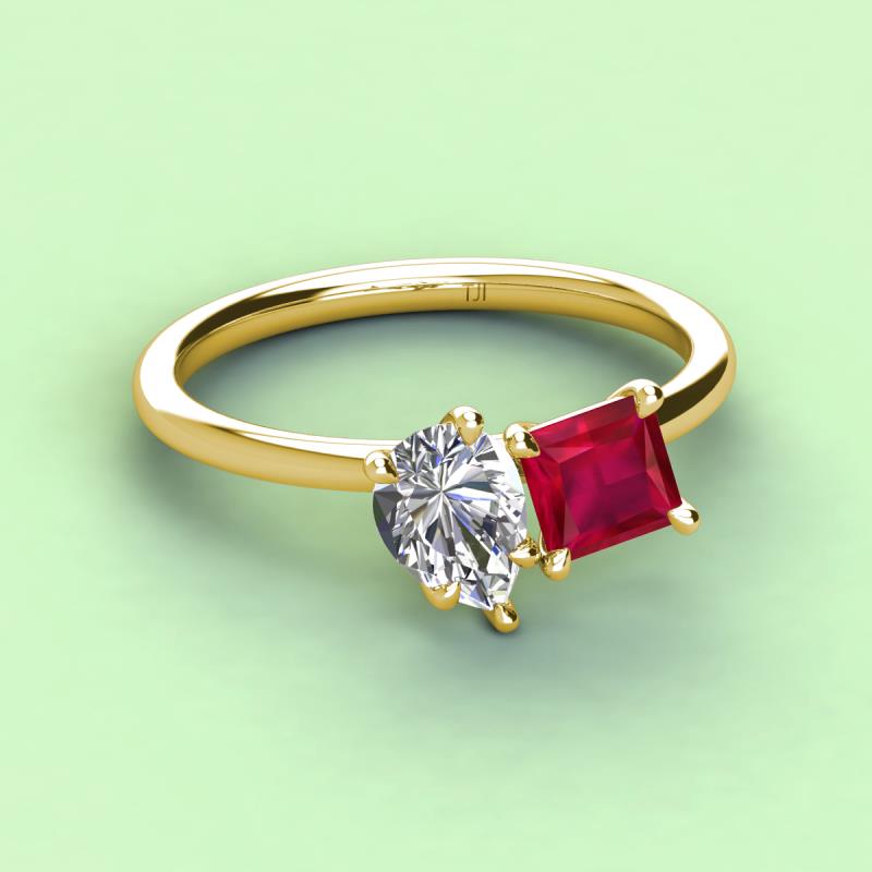 A beautiful symbol of everlasting love, this duo two-stone ring showcases a pair of Pear Shape Forever Brilliant Moissanite shimmering alongside of a luminous Princess Shape Lab Created Ruby crafted beautifully that represents two of you together.
