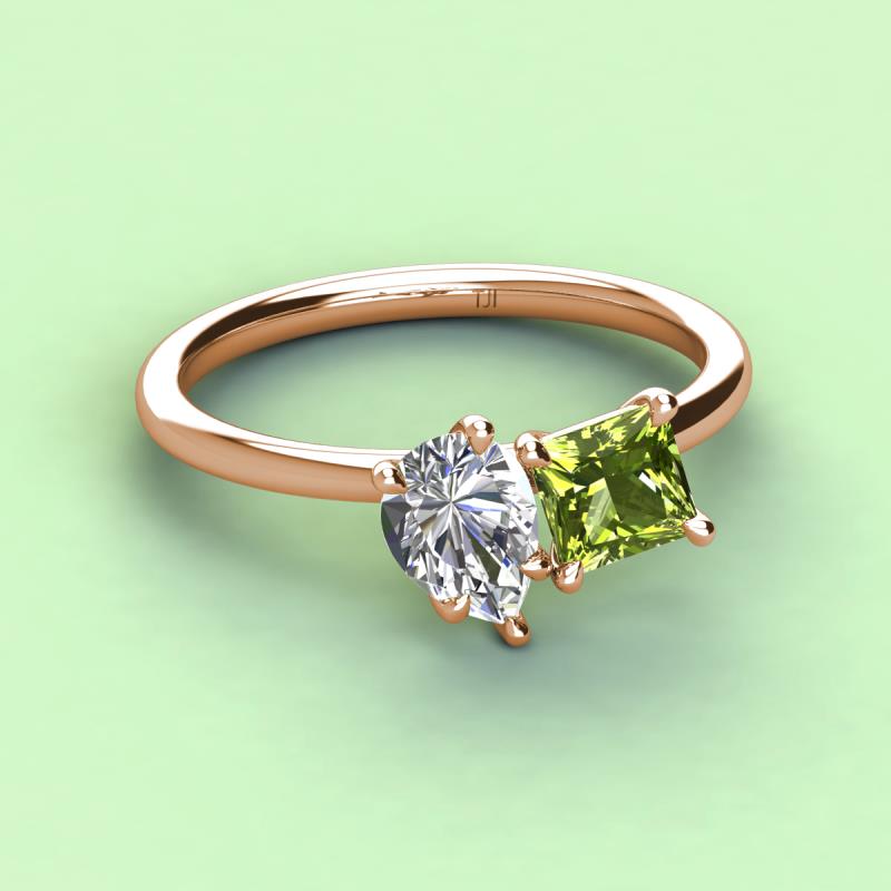A beautiful symbol of everlasting love, this duo two-stone ring showcases a pair of Pear Shape Forever Brilliant Moissanite shimmering alongside of a luminous Princess Shape Peridot crafted beautifully that represents two of you together.