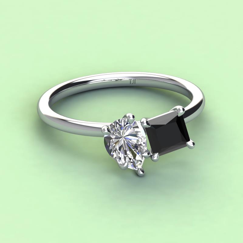 A beautiful symbol of everlasting love, this duo two-stone ring showcases a pair of Pear Shape Forever One Moissanite shimmering alongside of a luminous Princess Shape Black Diamond crafted beautifully that represents two of you together.