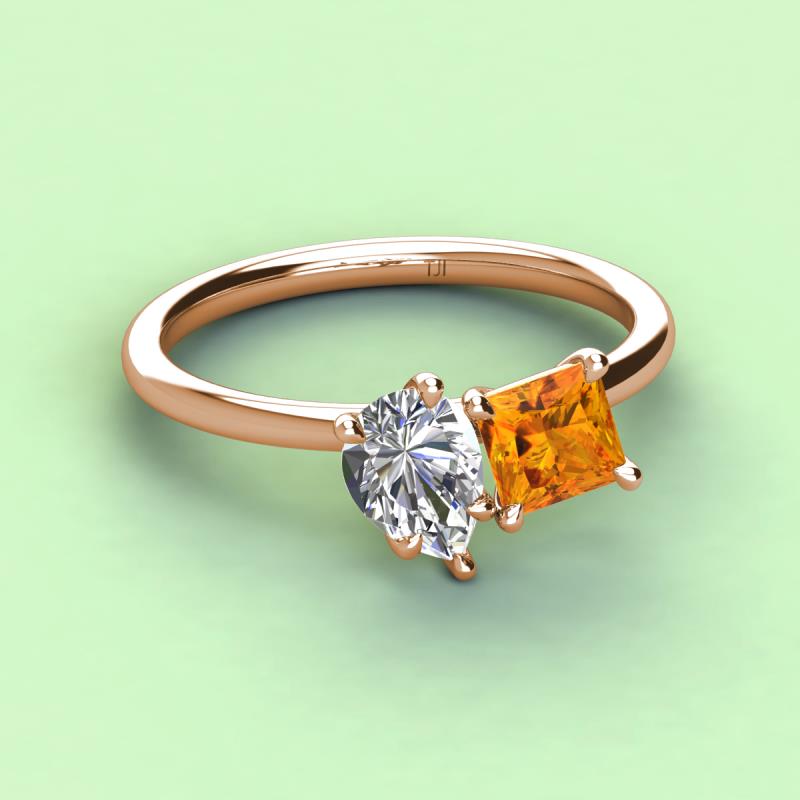 A beautiful symbol of everlasting love, this duo two-stone ring showcases a pair of Pear Shape Forever One Moissanite shimmering alongside of a luminous Princess Shape Citrine crafted beautifully that represents two of you together.