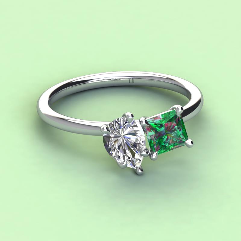A beautiful symbol of everlasting love, this duo two-stone ring showcases a pair of Pear Shape Forever One Moissanite shimmering alongside of a luminous Princess Shape Lab Created Alexandrite crafted beautifully that represents two of you together.