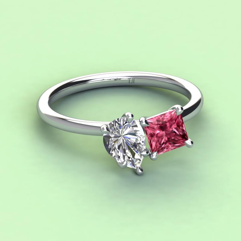 A beautiful symbol of everlasting love, this duo two-stone ring showcases a pair of Pear Shape Forever One Moissanite shimmering alongside of a luminous Princess Shape Pink Tourmaline crafted beautifully that represents two of you together.