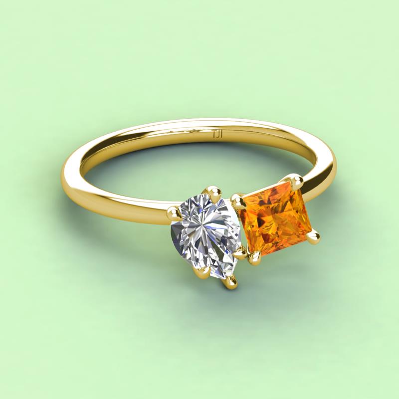A beautiful symbol of everlasting love, this duo two-stone ring showcases a pair of Pear Shape GIA Certified Diamond shimmering alongside of a luminous Princess Shape Citrine crafted beautifully that represents two of you together.