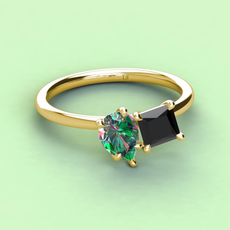 A beautiful symbol of everlasting love, this duo two-stone ring showcases a pair of Pear Shape Lab Created Alexandrite shimmering alongside of a luminous Princess Shape Black Diamond crafted beautifully that represents two of you together.