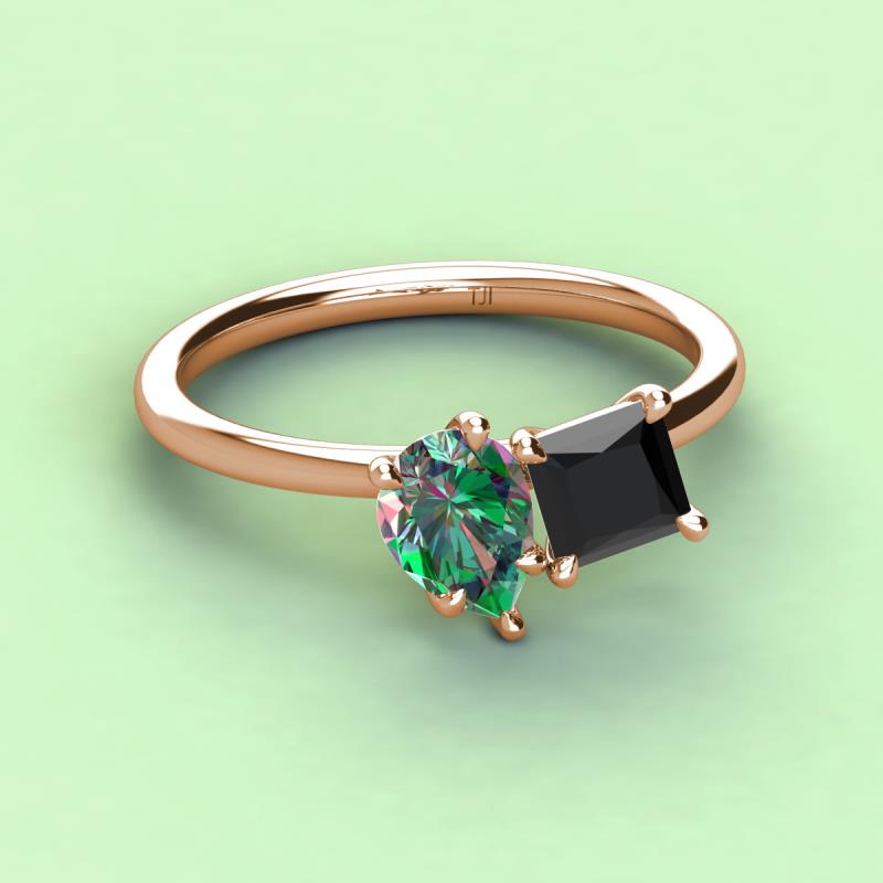 A beautiful symbol of everlasting love, this duo two-stone ring showcases a pair of Pear Shape Lab Created Alexandrite shimmering alongside of a luminous Princess Shape Black Diamond crafted beautifully that represents two of you together.