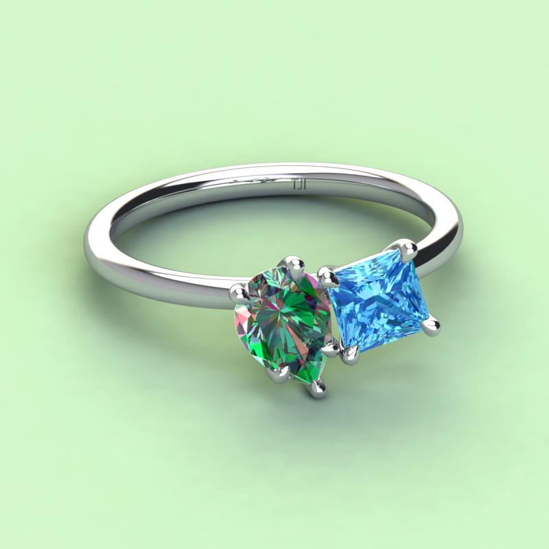 A beautiful symbol of everlasting love, this duo two-stone ring showcases a pair of Pear Shape Lab Created Alexandrite shimmering alongside of a luminous Princess Shape Blue Topaz crafted beautifully that represents two of you together.