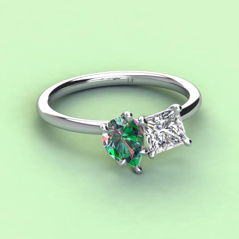 A beautiful symbol of everlasting love, this duo two-stone ring showcases a pair of Pear Shape Lab Created Alexandrite shimmering alongside of a luminous Princess Shape IGI Certified Lab Grown Diamond crafted beautifully that represents two of you together.