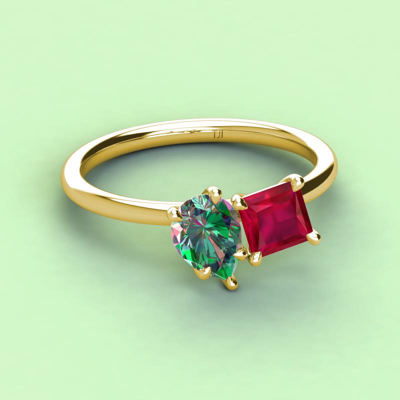 A beautiful symbol of everlasting love, this duo two-stone ring showcases a pair of Pear Shape Lab Created Alexandrite shimmering alongside of a luminous Princess Shape Lab Created Ruby crafted beautifully that represents two of you together.