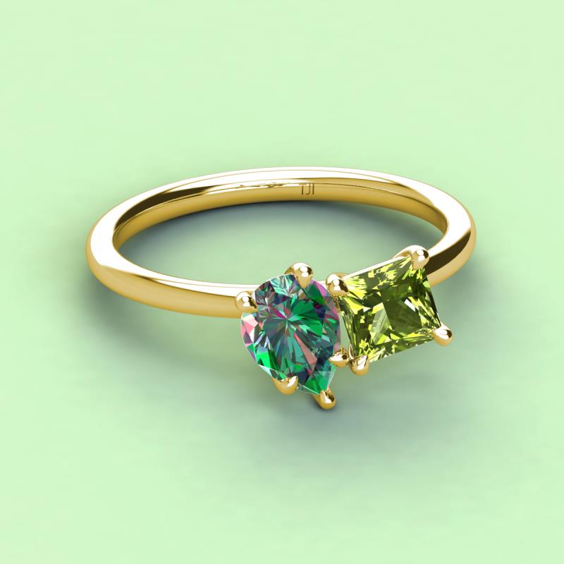 A beautiful symbol of everlasting love, this duo two-stone ring showcases a pair of Pear Shape Lab Created Alexandrite shimmering alongside of a luminous Princess Shape Peridot crafted beautifully that represents two of you together.