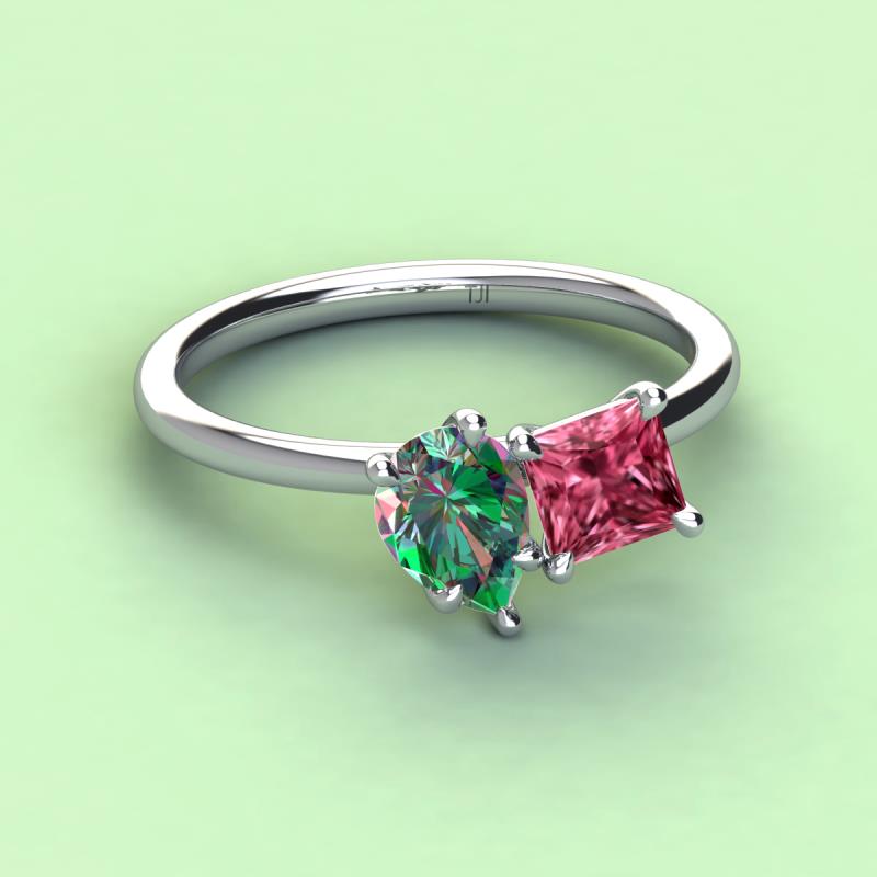 A beautiful symbol of everlasting love, this duo two-stone ring showcases a pair of Pear Shape Lab Created Alexandrite shimmering alongside of a luminous Princess Shape Pink Tourmaline crafted beautifully that represents two of you together.