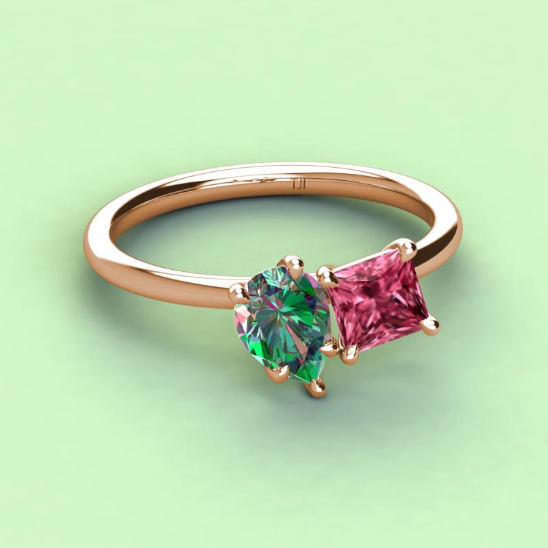 A beautiful symbol of everlasting love, this duo two-stone ring showcases a pair of Pear Shape Lab Created Alexandrite shimmering alongside of a luminous Princess Shape Pink Tourmaline crafted beautifully that represents two of you together.