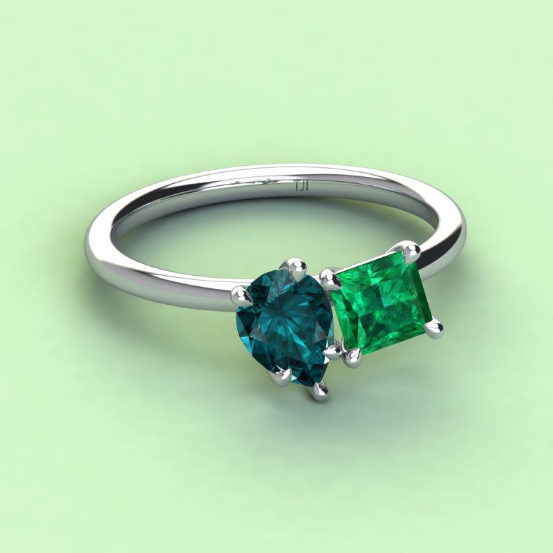 A beautiful symbol of everlasting love, this duo two-stone ring showcases a pair of Pear Shape London Blue Topaz shimmering alongside of a luminous Princess Shape Lab Created Emerald crafted beautifully that represents two of you together.