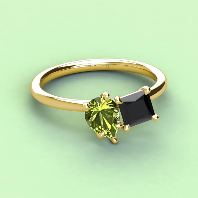 A beautiful symbol of everlasting love, this duo two-stone ring showcases a pair of Pear Shape Peridot shimmering alongside of a luminous Princess Shape Black Diamond crafted beautifully that represents two of you together.