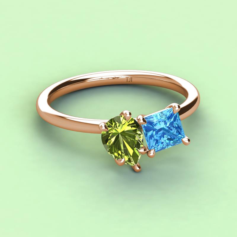 A beautiful symbol of everlasting love, this duo two-stone ring showcases a pair of Pear Shape Peridot shimmering alongside of a luminous Princess Shape Blue Topaz crafted beautifully that represents two of you together.
