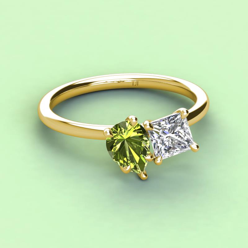 A beautiful symbol of everlasting love, this duo two-stone ring showcases a pair of Pear Shape Peridot shimmering alongside of a luminous Princess Shape Forever Brilliant Moissanite crafted beautifully that represents two of you together.