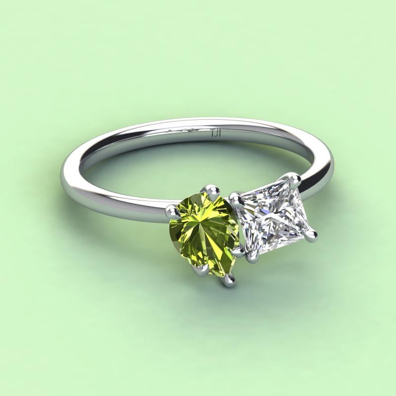 A beautiful symbol of everlasting love, this duo two-stone ring showcases a pair of Pear Shape Peridot shimmering alongside of a luminous Princess Shape Forever One Moissanite crafted beautifully that represents two of you together.