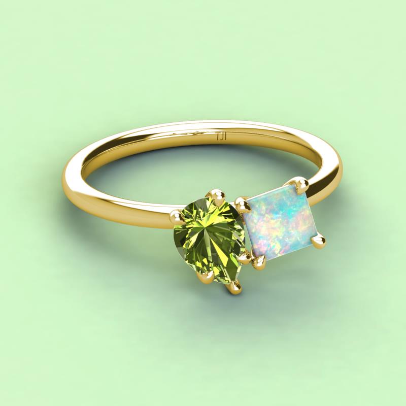 A beautiful symbol of everlasting love, this duo two-stone ring showcases a pair of Pear Shape Peridot shimmering alongside of a luminous Princess Shape Lab Created Opal crafted beautifully that represents two of you together.