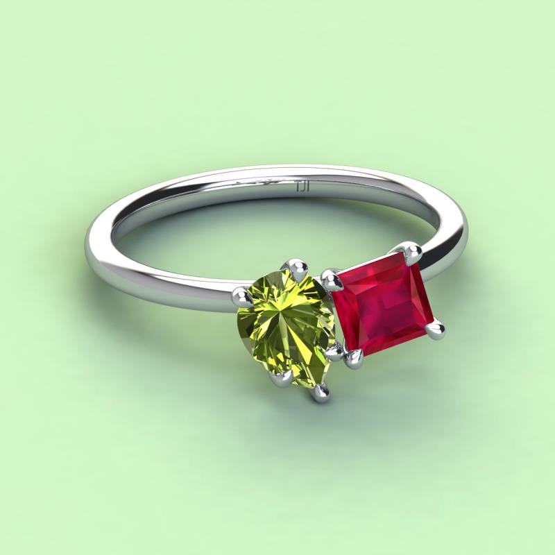 A beautiful symbol of everlasting love, this duo two-stone ring showcases a pair of Pear Shape Peridot shimmering alongside of a luminous Princess Shape Lab Created Ruby crafted beautifully that represents two of you together.