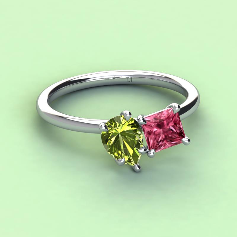 A beautiful symbol of everlasting love, this duo two-stone ring showcases a pair of Pear Shape Peridot shimmering alongside of a luminous Princess Shape Pink Tourmaline crafted beautifully that represents two of you together.