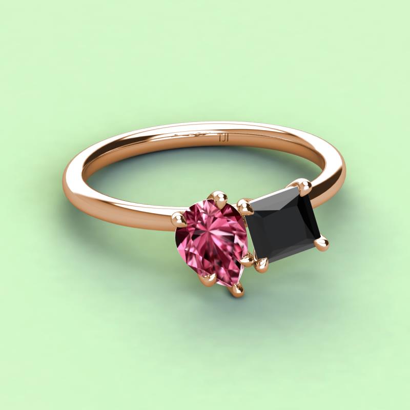 A beautiful symbol of everlasting love, this duo two-stone ring showcases a pair of Pear Shape Pink Tourmaline shimmering alongside of a luminous Princess Shape Black Diamond crafted beautifully that represents two of you together.