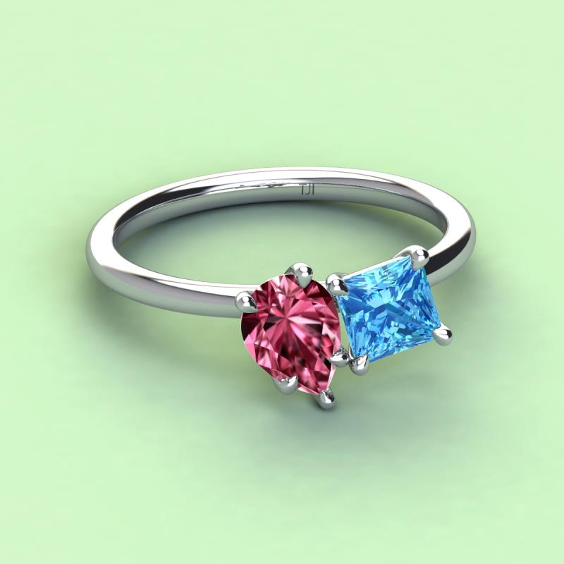 A beautiful symbol of everlasting love, this duo two-stone ring showcases a pair of Pear Shape Pink Tourmaline shimmering alongside of a luminous Princess Shape Blue Topaz crafted beautifully that represents two of you together.