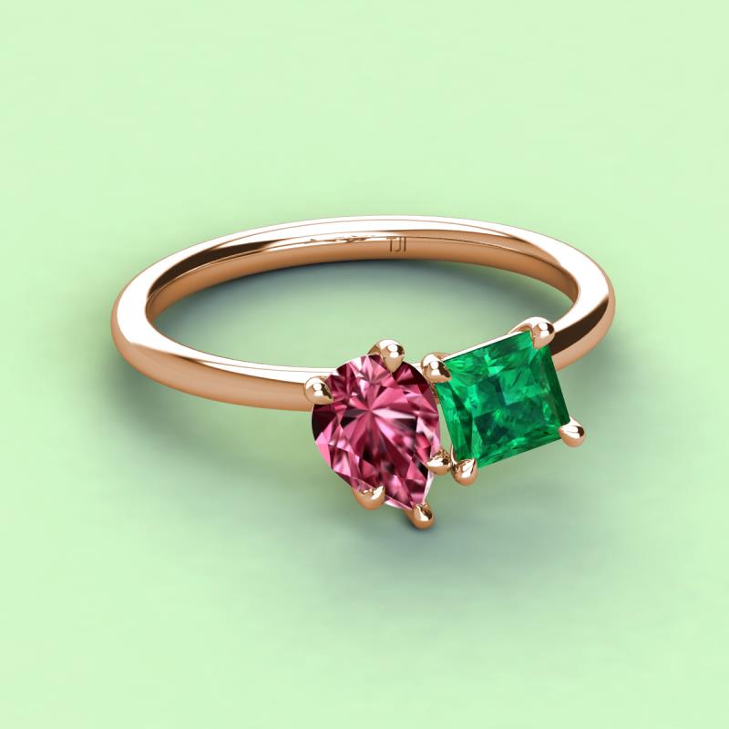 A beautiful symbol of everlasting love, this duo two-stone ring showcases a pair of Pear Shape Pink Tourmaline shimmering alongside of a luminous Princess Shape Lab Created Emerald crafted beautifully that represents two of you together.