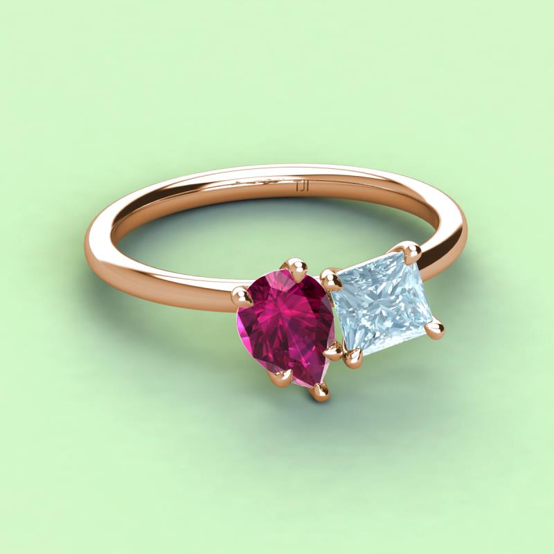A beautiful symbol of everlasting love, this duo two-stone ring showcases a pair of Pear Shape Rhodolite Garnet shimmering alongside of a luminous Princess Shape Aquamarine crafted beautifully that represents two of you together.