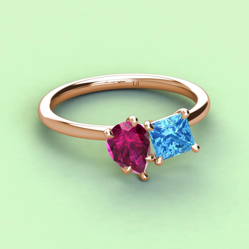 A beautiful symbol of everlasting love, this duo two-stone ring showcases a pair of Pear Shape Rhodolite Garnet shimmering alongside of a luminous Princess Shape Blue Topaz crafted beautifully that represents two of you together.