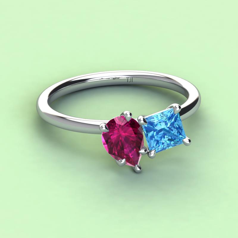 A beautiful symbol of everlasting love, this duo two-stone ring showcases a pair of Pear Shape Rhodolite Garnet shimmering alongside of a luminous Princess Shape Blue Topaz crafted beautifully that represents two of you together.