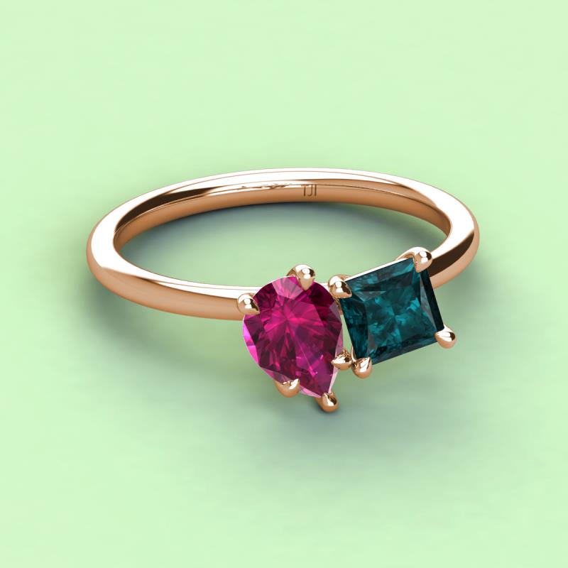 A beautiful symbol of everlasting love, this duo two-stone ring showcases a pair of Pear Shape Rhodolite Garnet shimmering alongside of a luminous Princess Shape London Blue Topaz crafted beautifully that represents two of you together.