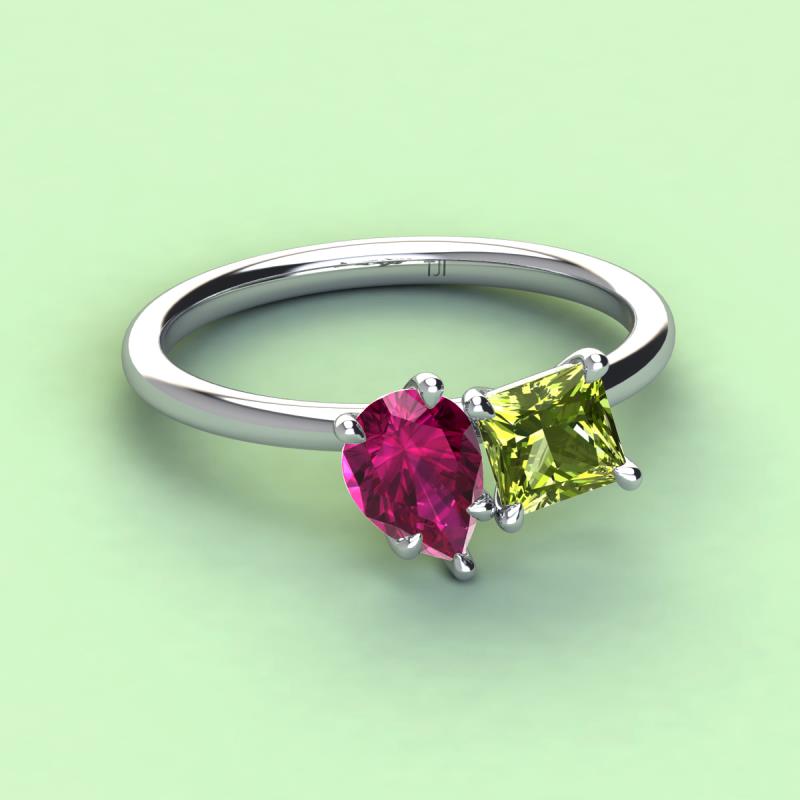 A beautiful symbol of everlasting love, this duo two-stone ring showcases a pair of Pear Shape Rhodolite Garnet shimmering alongside of a luminous Princess Shape Peridot crafted beautifully that represents two of you together.
